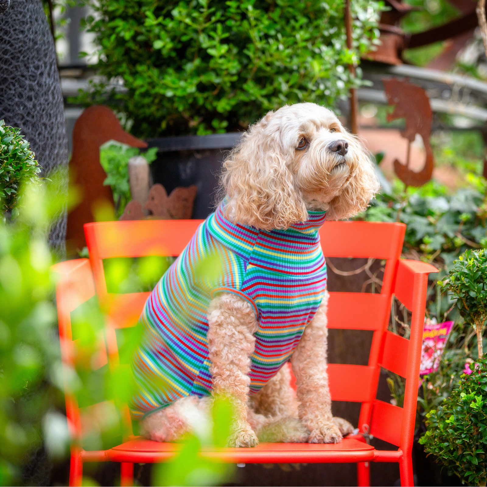 We found that living in a colder climate Millie needed an outfit to put on when she was out and about. We designed the onesies and tees to be super stretchy, making them easy to put on. Both Andrew and I, as well as Millie, love that these outfits which minimise fur from getting all over the furniture as it means she can relax anywhere she wants.